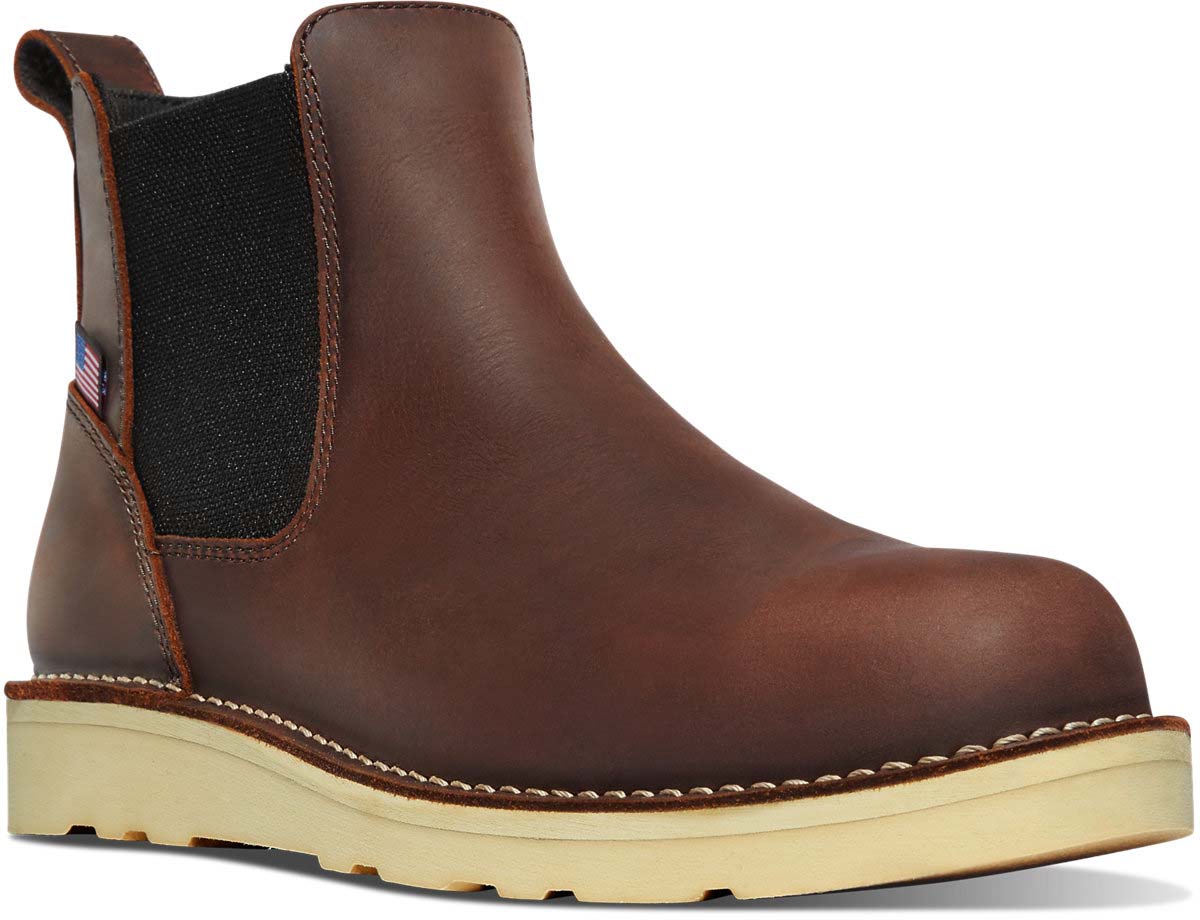 Whether you’re making service calls or working in the wood shop, you can count on the Bull Run Chelsea for durability and comfort. It has the same rugged design as the original Bull Run, updated with slip-on construction that makes it convenient for electricians and carpenters to slip them on and off when moving from outside to inside. A full-grain leather upper is soft yet durable. The oil-and-slip-resistant outsole keeps you comfortable for long days standing on wood, tile or concrete. Specifications for Danner Bull Run Chelsea 6in Shoes – Men’s: Manufacturer: Danner Gender: Male Age Group: Adults Boot Shaft Height: 6 in Boot Style: Chelsea Color: Brown Toe Type: Plain Toe, Plain Activity: Casual Weight: 50 oz Insole Material: Open Cell PU Water Resistance Level: Waterproof Lining Material: Mesh Outsole Material: Danner Wedge Features of Danner Bull Run Chelsea 6in Shoes – Men’s Durable, oiled, full-grain leather upper Chelsea construction provides easy on/off Cushioning open-cell OrthoLite footbed Steel Shank Handcrafted, stitchdown construction for strength and stability Danner Wedge non-marking, oil-and-slip-resistant outsole offers superior traction Electrical hazard protection ASTM F2892-18 EH Recraftable Package Contents: Danner Bull Run Chelsea 6in Shoes – Men’s