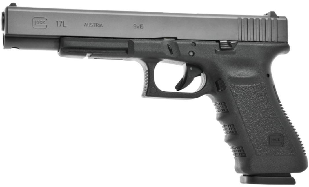 One of the first successful polymer framed designs, Glock handguns are common sidearms among law enforcement agencies and military organizations around the world. Although a striker-fired pistol, the Glock employs a single-action (SA) trigger, meaning that the trigger does not cock the gun, but only releases the striker when pulled. Cocking of the striker is performed by the retracting slide. Glock pistols have no manual safeties. The trigger is the only operating element. All three internal pistol safeties are deactivated when the unique single-action trigger is pulled, and automatically activated when it is released. For more information on the Glock design, please refer to the Glock pistol animation in the Basics section. Specifications for Glock 17L Pistol, 9mm Luger, 6.02in barrel: Manufacturer: Glock Gun Make: Glock Gun Model: Glock 17L Gun Type: Pistol Cartridge: 9mm Luger Barrel Length: 6.02 in Housing/Frame Material: Polymer Material: Integrated Polymer Sight Configuration: Fixed, White dot front, White square U rear Action Type: Recoil Operated Semi-Automatic Safety Type: Safe Action Trigger Safety Trigger Action: Striker Single-Action (SA) Barrel Twist Rate: 1-9.84 RH Rifling Profile: Hexagonal Magazine Capacity: 19 Round Production Year: 1988 – Ongoing Weight: 26.63 oz Height: 5.47 in Width: 1.3 in Length: 9.53 in Muzzle Velocity: 1247 ft/s Muzzle Energy: 428 ft-lbs